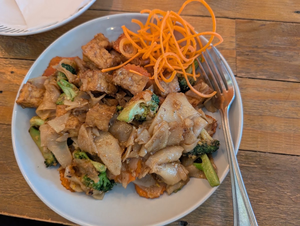 Here for lunch, sharing a Pad Kee Mao and Mango Salad. Lunch special comes with a small coconut-based soup. I dislike that most of the menu price does not include common protein, instead asking for add-on pricing even for chicken. Mango is salad is very ripe, not the traditional green mango in SE Asian cooking. We ordered mild but staff hooked up the Prik Nam Plaa jars, which were very authentic.